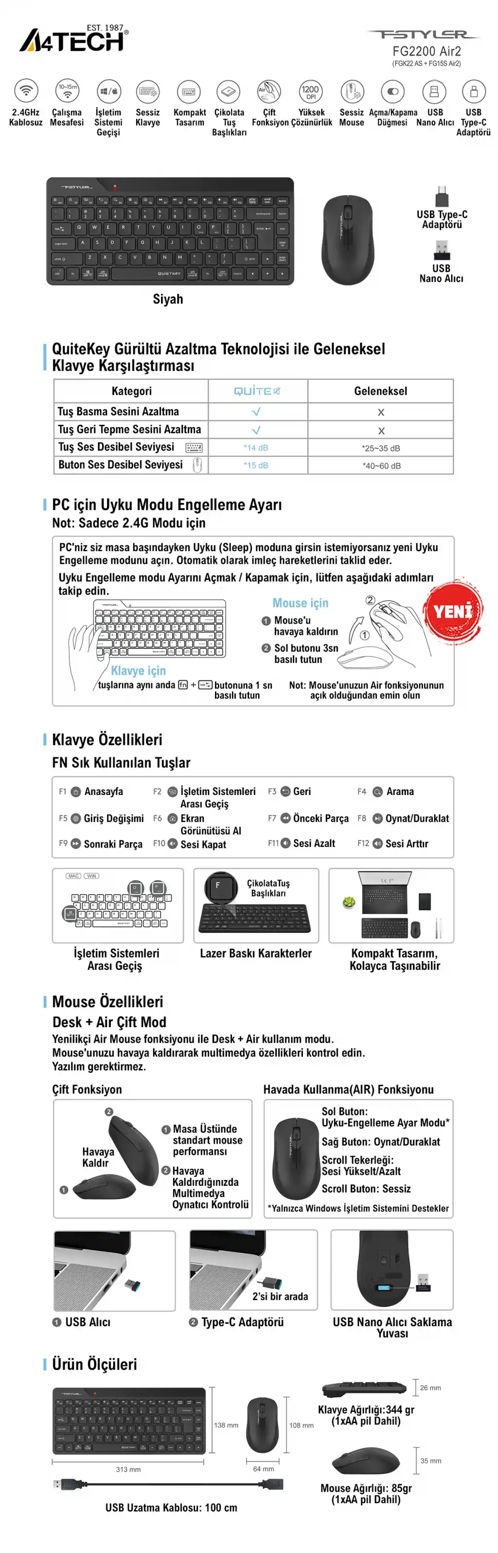 Ürün Adı: A4 TECH FG2200 AIR2 Q Türkçe Kablosuz Siyah Mini 1200dpi Klavye+ Mouse