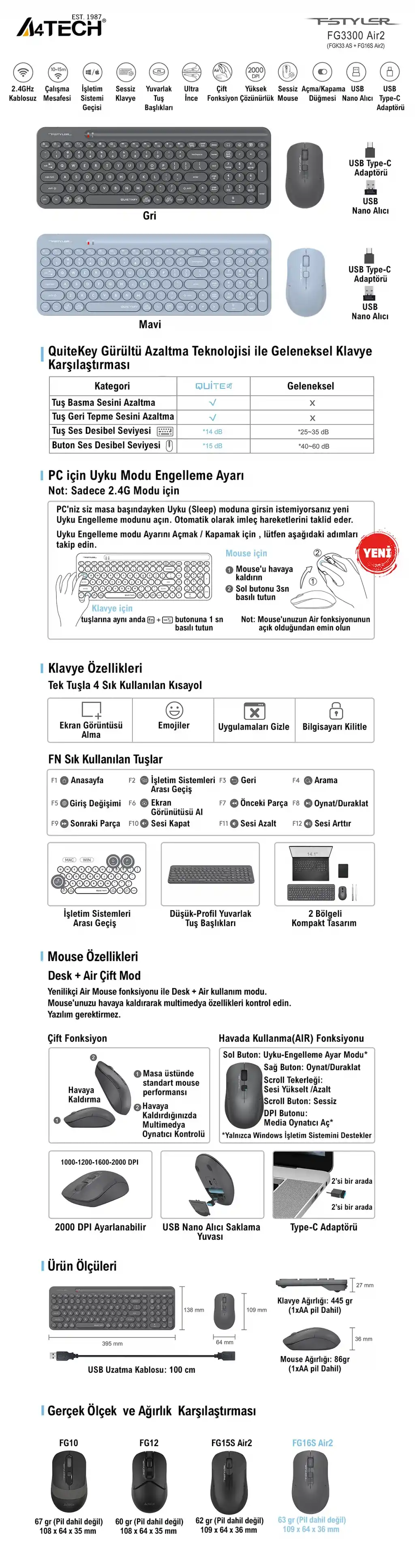 A4 TECH FG1010 F Türkçe Kablosuz (F KLAVYE) Gri 2000dpi Klavye+ Mouse